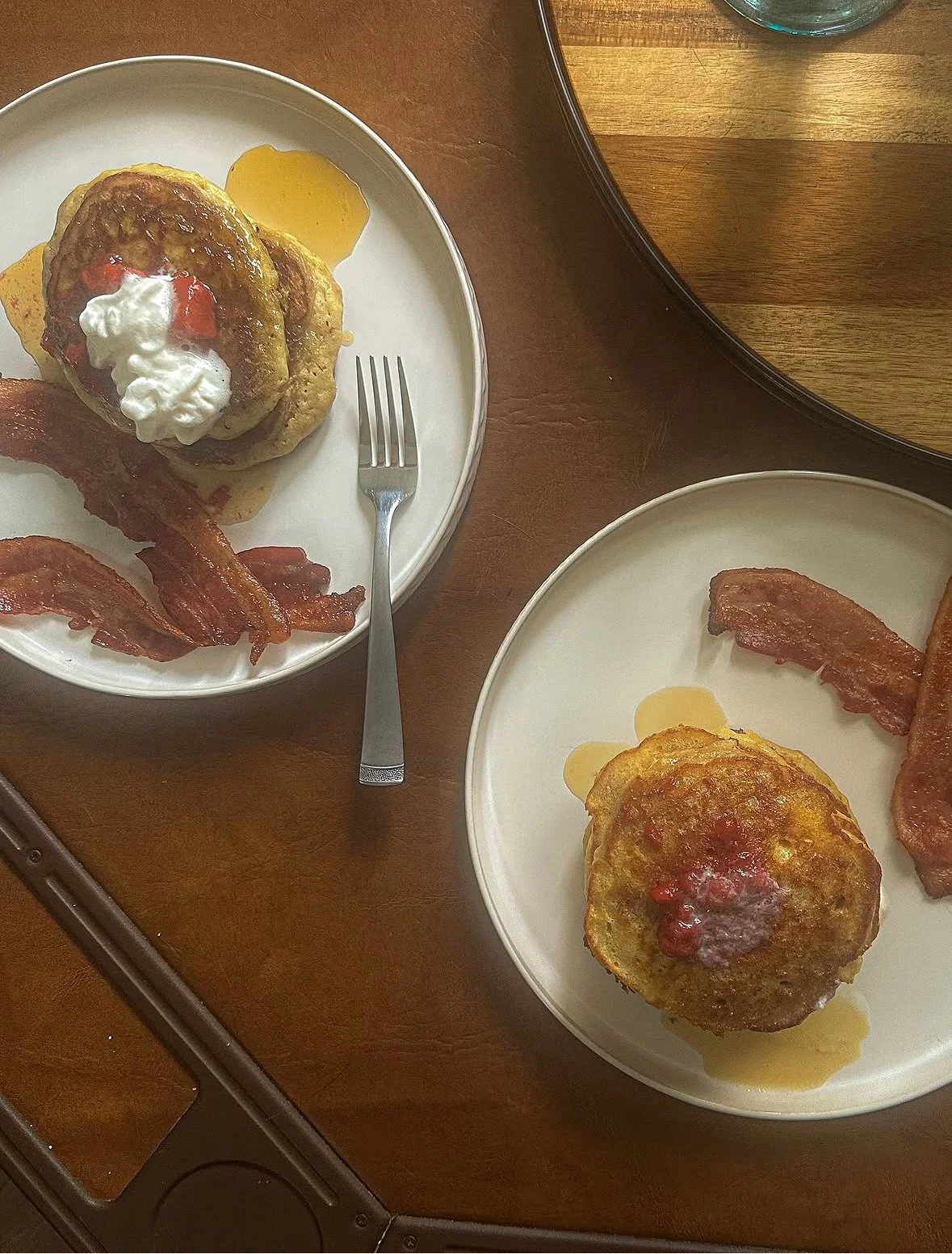 Stack them while they’re still warm. Add a spoonful of lightly whipped, just-sweet cream, something jammy and bright, and a slow pour of real maple syrup. It’s a little indulgent, a little messy, and exactly the point.